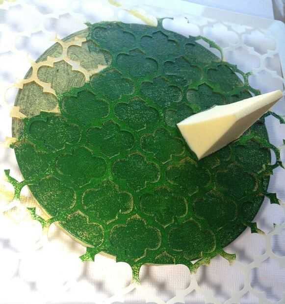 Pintar la tapa y los lados de la base – comenzó con verde oscuro, y presenta manchas de pintura de oro sobre él cuando el verde estaba secado. Cuando el oro estaba seco, secó el verde a través de una plantilla con una esponja cosmética. Cuando la pintura seque, cepillar en una capa de medio cristal para sellar. Pintura y sellar la parte inferior si lo desea, después de pegar en los pies.