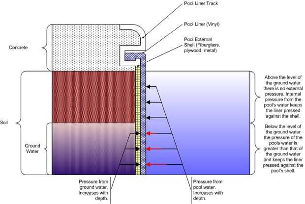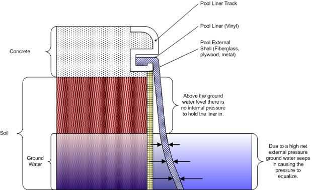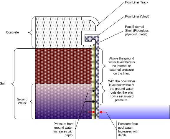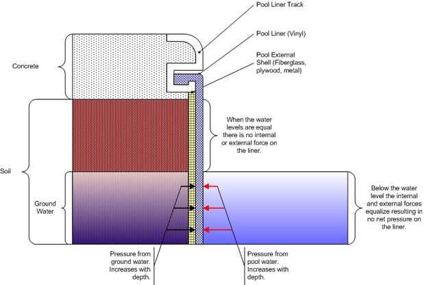 Se muestra en las imágenes es un ejemplo de una piscina de vinilo forrado con una cáscara dura exterior y un nivel de agua del suelo respetablemente alta fuera de la piscina. El agua subterránea está sentado sólo metro saturar el suelo pero de hecho algo de una superficie que tiene. Como el nivel de agua de la piscina es igual o superior al nivel superficial de las aguas subterráneas es una mayor presión de agua de la piscina y así un neto exterior fuerza sosteniendo el revestimiento contra la pared de la cáscara externa de la piscina. Como agua continúa a vaciarse de la piscina el nivel superficial de agua de la piscina cae por debajo de las aguas subterráneas y una presión interna neta se convierte. Esta presión interna neta es el resultado del hecho de que hay más presión de agua en el exterior que el interior. Si la cáscara de la piscina es porosa o sin sellar el agua se filtra a través de la cáscara y recoge detrás de la línea. Si esto sucede rápidamente el trazador de líneas aparecerán flotando hacia arriba desde el fondo de la piscina y recoge más agua por debajo de ella se extrae el agua más arriba. Si la cáscara está bien sellado y no porosa luego la penetre se producirá lentamente permitiendo la piscina para seguir vaciando y creando una acumulación de presión en el eventual colapso de las paredes de cáscara de la piscina exterior o empujando hacia arriba de la tierra.