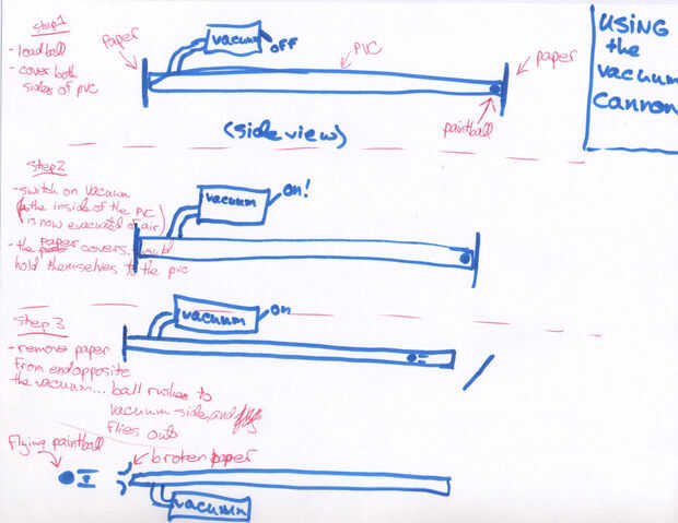 Poner la bola en el extremo del PVC que no tiene el conector en él. Tapa los extremos del PVC con el periódico; puede que necesite a un compañero para esta parte. Encienda la aspiradora y el periódico debe atenerse a los extremos; debe crearse un vacío dentro del PVC. Ahora, tienen como objetivo algo no vivo, o que posiblemente podría dañarse y tirar el periódico fuera el final que carga. Va a tirar la pelota hacia el otro lado con una velocidad impresionante.