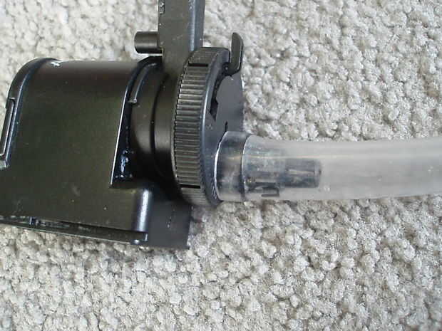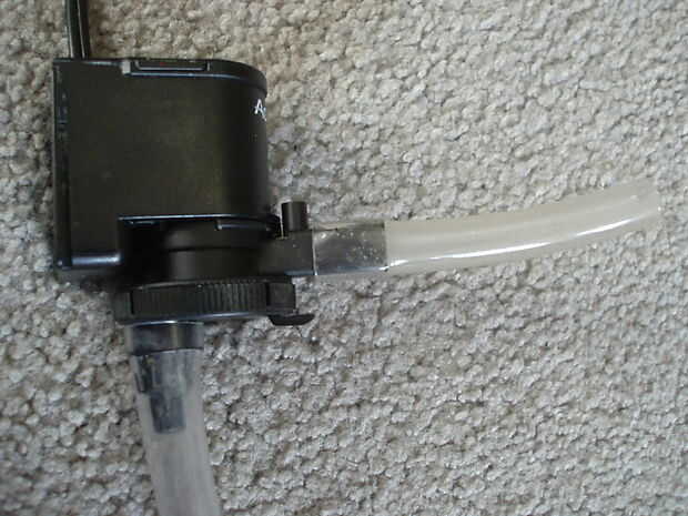 Encontrar un pedazo de tubo que se adapta firmemente alrededor de la entrada del cabezal mecánico.  Cortar un trozo de uno a dos pies de largo.  Encontrar un tamaño que encaja en la toma de corriente (probablemente no el mismo tamaño) y cortar un trozo de 3 pulgadas de largo.  El cabezal de potencia normalmente tiene un Ajustador de flujo.  Yo uso el ajuste de flujo más alto, pero una bomba más potente que deba utilizarse en una posición más baja.