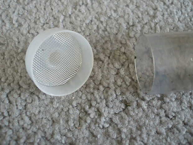 he añadido un prefiltro para coger los trozos grandes en la aspiradora de grava.  Las cosas pequeñas no duele la cabeza de poder pero los trozos más grandes obstruyen.  Utilicé una malla de aluminio que tiene los agujeros muy pequeños y que es forma bastante bien cuando se forman en una forma cóncava.  Puse el disco de malla con el lado cóncavo hacia el orificio de salida para que la malla no se presiona contra el orificio.  Esto proporciona más superficie para recoger material grueso.
