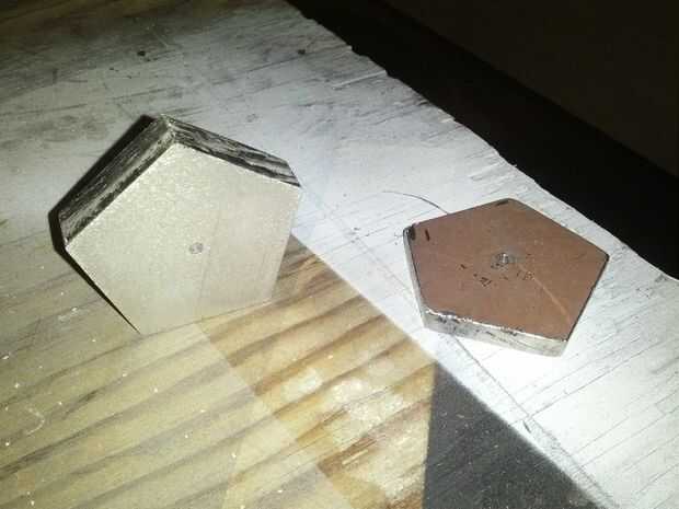 El centro del Pentágono fue cortado en tres piezas de 1/4" placa de acero con un agujero perforado en cada esquina del Pentágono. La placa posterior del impulsor se intercala entre los cubos de acero, uno en la parte posterior, dos en la parte delantera.