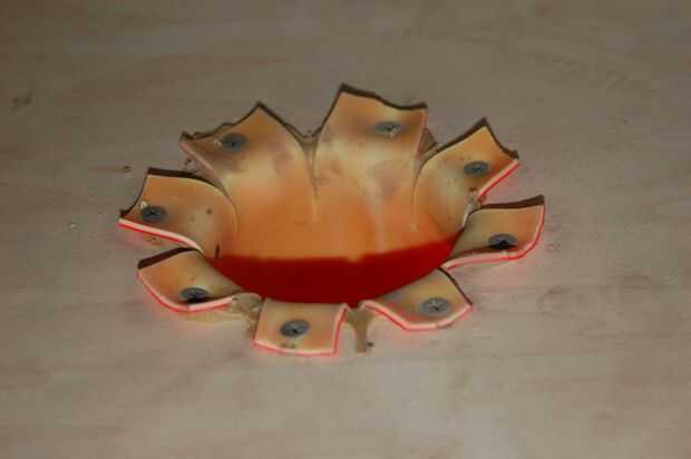 7. el otro extremo del cono penetra a través de la otra broca de madera contrachapada y me corte ranuras en el extremo, más clavos líquidos, luego lo había jodido. (Ver imagen)