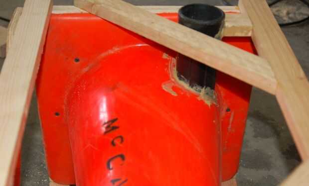 3. corte del balompié en forma de agujero hacia la parte inferior del cono sólo lo suficientemente grande como para empujar el tubo en y que no caiga. Extremo del tubo en el interior debe estar cerca de la pared por lo que la basura se deslice alrededor y luego hacia abajo.