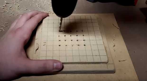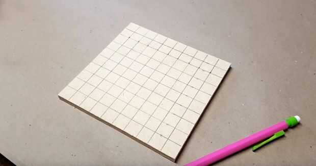 A continuación, coloque una rejilla de 1/2 plazas sobre la base MDF. Esta será la guía para taladrar los agujeros. Dependiendo del tamaño de su caja, puede que necesite ajustar el tamaño y el espaciamiento de los agujeros. La broca que utilicé era 1/8", pero agujeros más pequeños son mejores, por lo que aspiro para 1/16" o más pequeñas.