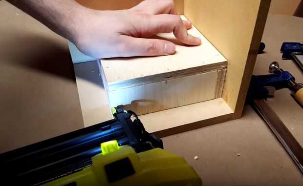 Después de que ha cortado todas sus piezas, ensamblar los lados, parte superior y parte inferior con pegamento de madera. Sólo usé simples empalmes a tope en todas las piezas porque es rápido y fácil. Cuando todo se pega para arriba, estas juntas son más de lo suficientemente robustas para soportar la fuerza del vacío. Para reducir el tiempo de espera, usé a mi clavadora para unir las piezas mientras seca por lo que podía pasar a los otros pasos del proyecto. También podría utilizar tornillos, pero asegúrese de taladrar previamente para evitar rajaduras de la madera.