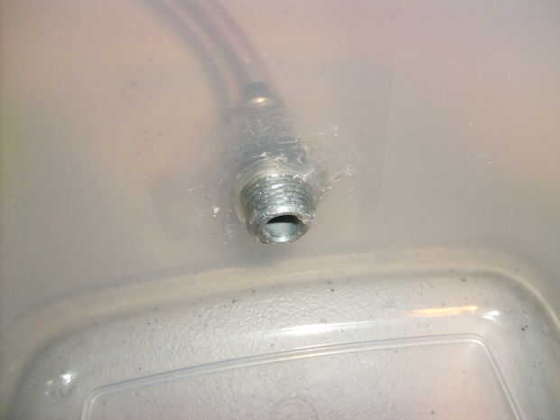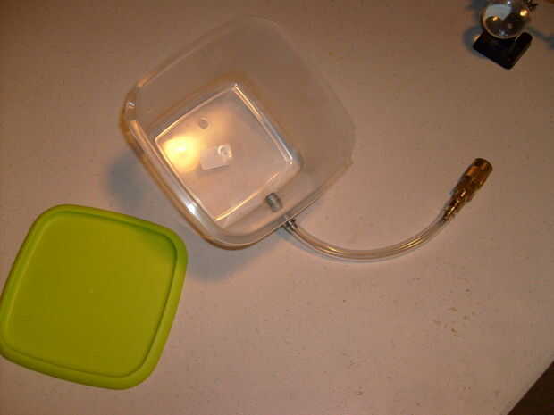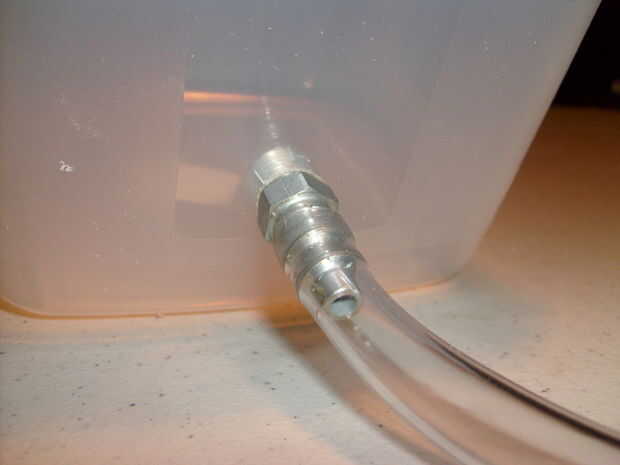 Cuando tienes un agujero en el lado del contenedor, atornille el conector y luego de pegamento caliente o pegamento de caucho la boquilla en su lugar desde el interior.