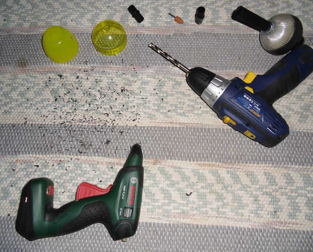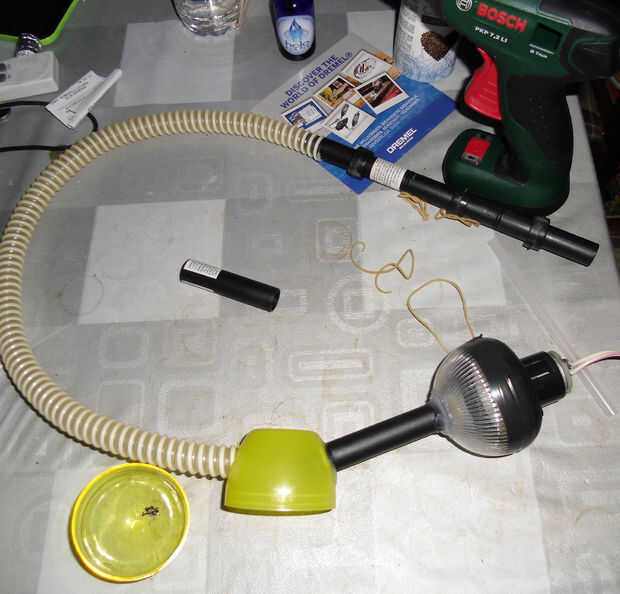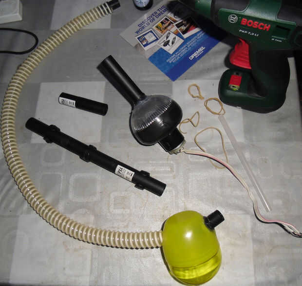 Toma de aire del taladro y poner la manguera a través, del taladro hacia fuera de salida de aire y pegar allí la articulación. Salida de aire debe hacer frente lado del motor y toma de aire al lado de la manguera. Polvo se recogerán dentro de este contenedor, se llenará con esponjas etc. para absorber partículas de polvo más pequeñas, pero asegúrese de no sobrellenar y ahogar el motor.