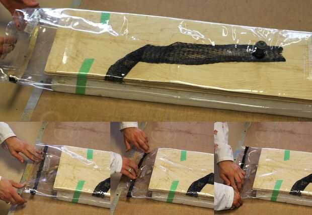 Una vez que su proyecto es completamente dentro de la bolsa, coloque el respirador de la cinta debajo de la válvula de la bolsa de la red. Esto ayudará a evitar que la válvula se adhiera a la superficie de su proyecto y permitir que el aire evacuar uniformemente cuando empiezas a bombear. Cuando tenga el respirador de la conjunto de la red, puede despegarse el respaldo de su precinto y comienzan a Presione firmemente a ambos lados de la bolsa de vinilo.