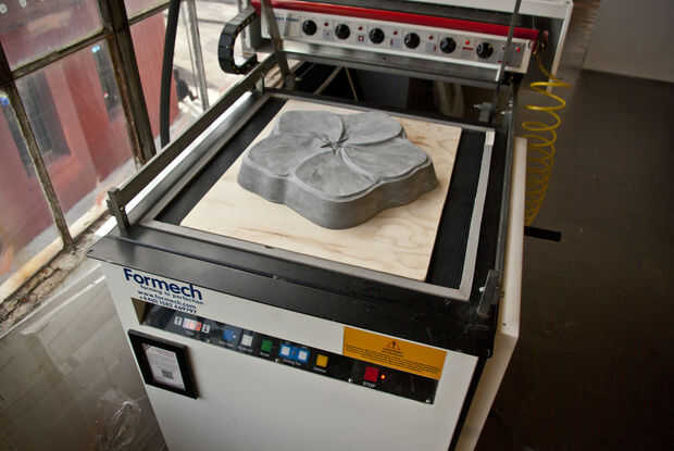 Para un molde que se va a llenar de hormigón, utilizamos 3/16" espesor ABS (negro) o 1/8" espesor poliestireno (blanco). Corte el plástico de 26 "x 26", que es el tamaño más grande que cabe en el Formech 660 en la tienda de tecnología.