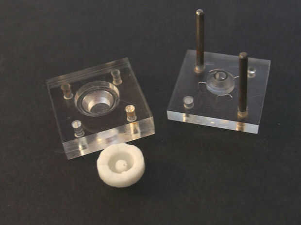 Las dos partes del molde están montados usando 1,8 mm diam aplanado clavos como los pernos de alineación.