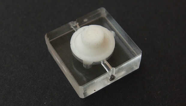 Para hacer que el botón de goma, preparar moldeable transparente de silicona (el mismo utilizado para la membrana del LED) o oogoo (preferible!) y fundido en el molde. Cierre el molde y exprima el exceso de goma. Para oogoo espera 30-60 min y luego abrir el molde, retirar cuidadosamente la pieza.