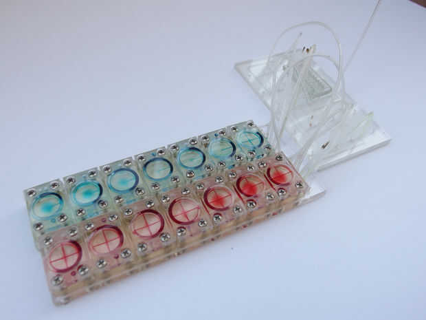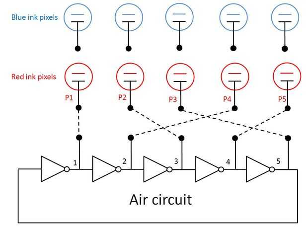 Para mi circuito fluídico "chaser de luz de LED" tengo elegido utilizar un circuito oscilador de anillo neumático. En analogía a la contraparte electrónica utiliza transistores fluídicos (válvulas) y resistencias (pequeños canales) y condensadores fluídicos (volúmenes de la cámara y el tubo).
