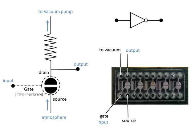 En el inversor fluídico cuando se aplica un vacío (alto) a la puerta (membrana) de la válvula de la membrana se levanta y abre un paso entre los dos terminales para que fluya aire desde el orificio abierto a la atmósfera a través del canal de la resistencia a la bomba de vacío. Debido a la caída de presión en el canal estrecho y largo resistencia no será significativo nivel de vacío en el orificio de salida (bajo). Es que una señal de vacío en la entrada se transforma en una señal de "presión atmosférica" en la salida y viceversa.