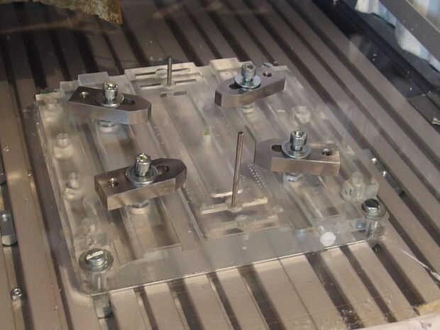 Usted tendrá que hacer frente/parte posterior fresado en las caras de una placa de plexiglás con las características de un lado con características en el otro lado. Para poder hacer esto hay que preparar un "accesorio de fresado" que le permite a colocar la placa de plexiglás en exactamente la misma posición después de haberlo dado vuelta. Puede preparar un accesorio fresado por montaje, por ejemplo, un bloque grande de plástico en su molino. El bloque en el preferido trabajar zona de su molino y arreglarlo. Luego hacer un "moler de cara" con algún molino de punta plana para obtener una superficie plana y nivelada. Continuación, elija el cero de su sistema de coordenadas relativo por ejemplo en el centro del bloque molido. Molino en conocido posiciones algunos agujeros de diámetro exacto por ejemplo 3 mm diám. En este caso se necesitan pernos de alineación cilíndrico 3 mm diam. Usé las varillas utilizadas como guías para la cabeza de lectura y escritura en disquetes y unidades de CD. Estas barras son agradables como pernos de alineación, ya que son muy precisas. A menudo tienen un diámetro de 3 mm. Una vez que han blanqueado al menos dos de estos agujeros de alineación en su bloque a una distancia de digamos 15 - 20 cm aparte le molino algunos tornillo de agujeros para fijar la pieza de trabajo en el bloque.