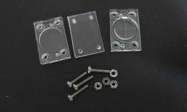 Para el uso de membrana de silicona una placa de cristal del molde y untar todo con unas gotas de jabón de fregar los platos con los dedos, hasta que el jabón parece se han secado. Cuando empiezas a ver los "frotis" producidos por el dedo haya terminado. Precisamente estas "manchas jabón" servirá como una capa de "anti-stick" para nuestro casting de silicona. Para echar la silicona Coloque la placa de vidrio sobre una superficie bien nivelada. Una vez que se ha solidificado su membrana fundido pelar apagado y corta con el tamaño de las capas de plástico LED molido previamente. Deberá perforar agujeros en la membrana de silicona de corte en los puntos de los agujeros de tornillo. Para ello es una buena idea utilizar un clavo aplanado (alrededor de 2 mm diam) encajan en los orificios de tornillo como una herramienta de perforación. Intercalando la membrana entre las dos capas de plástico molidas luego puede perforar agujeros en las posiciones de derecha con agujeros de tornillo en las capas de plástico como una "máscara de perforación".