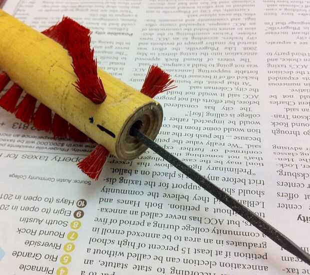 El agujero en el cepillo del rodillo era bruñido liso por el eje estriado de spinning.  Llevar un archivo de aguja con un borde afilado (como un archivo plano o triangular) y presentar varios surcos en el interior del agujero.  Estas ayudarán al anclaje de epoxy en el cepillo de rodillo.