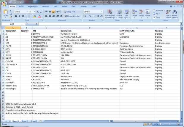 Los archivos de Eagle PCB pueden presentarse luego a tu casa favorita de fabricación de PCB. Una vez que tienes un PCB puede ordenar todas las piezas en la lista de materiales. El archivo de Excel listas todas las piezas que se necesitan, la cantidad y número de parte. Las piezas están disponibles en Digikey y la pantalla LCD se compra a través de EastRising (buydisplay.com). Seguir adelante y pedir todos los las partes que necesita.