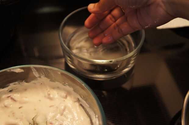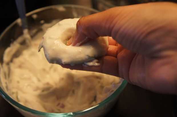2) mojar sus dedos y tome una pequeña porción de la masa, con el pulgar hacer agujero en el centro y caer lentamente en el aceite (tenga cuidado). prensa de Donut puede utilizarse también para que sea más fácil.