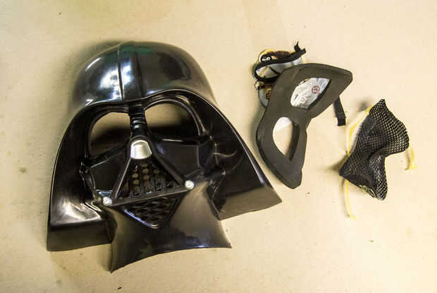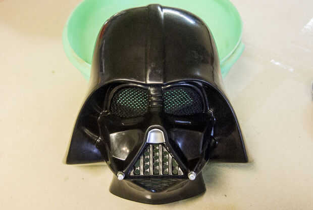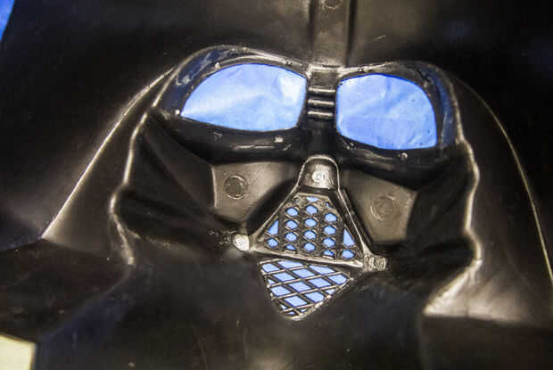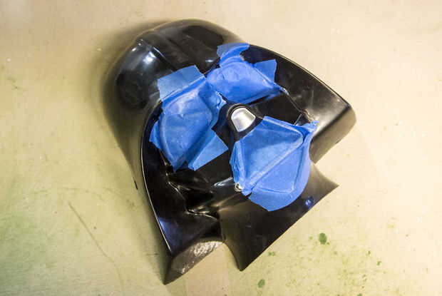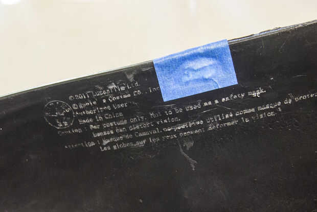 Usé cinta azul para cubrir las aberturas para los ojos, boca y orificios para la correa. Cinta adhesiva va a funcionar mejor para los ojos. Mientras que la pieza estaba siendo empacados, la cinta se movió y no noté que uno de los ojos tenía un bulto enorme que tuvo que ser lejos.