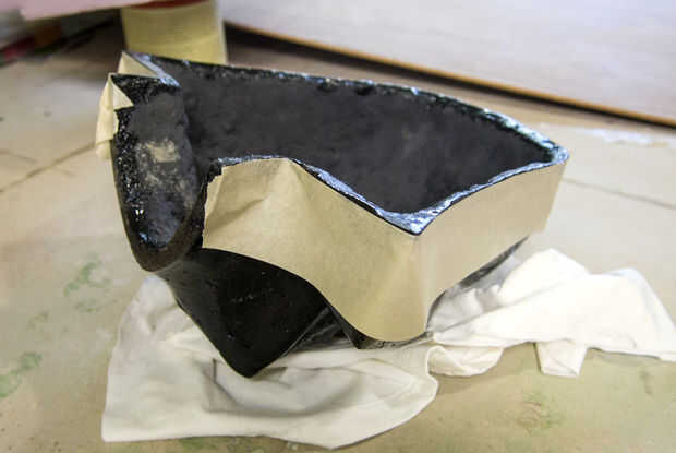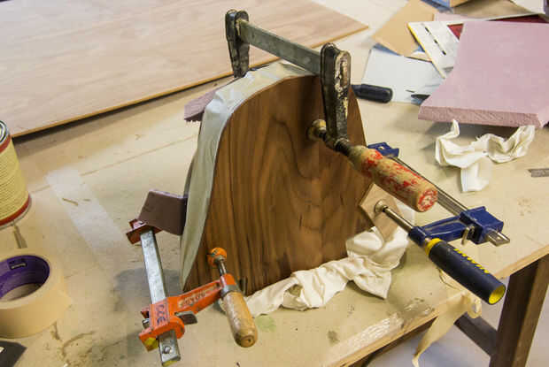 La parte posterior de mi pieza no era exactamente plana así que el grupo tuvo que fijarse en algunos lugares. E6000 tarda 24-72 horas hasta curación completa, y yo estaba impaciente y quita las abrazaderas en 4 horas, que me dejó con una gran diferencia...