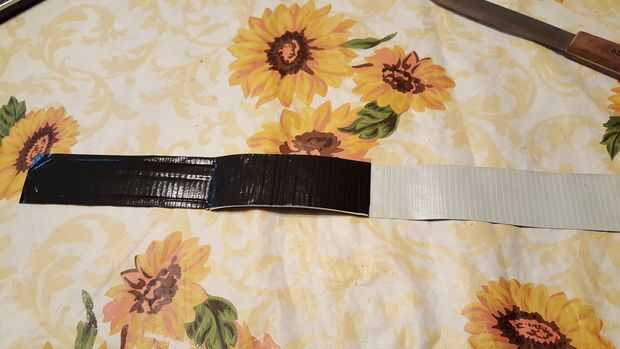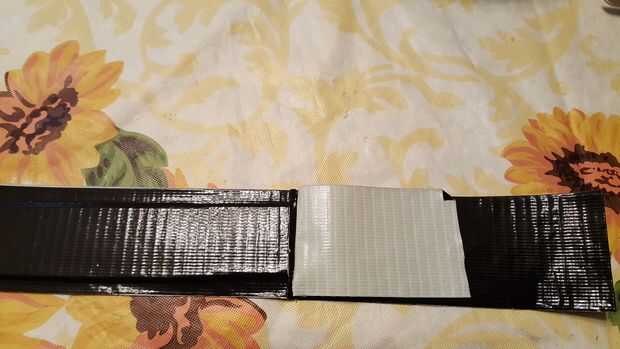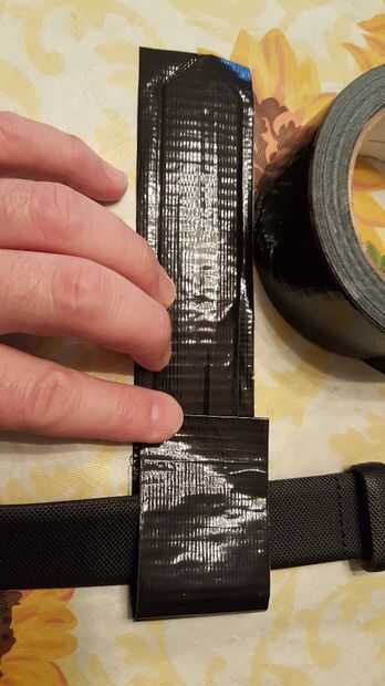 Medir el tamaño del lazo con el cinturón y permitir espacio extra. Envuelva la cinta hacia la parte delantera. En la primera foto, tengo algún golpecito sobra que no era necesario. Me presiona la cinta firmemente luego lo había recortado cerca el cuchillo de apertura. La segunda imagen muestra mi comprobar en el dimensionamiento de la correa.