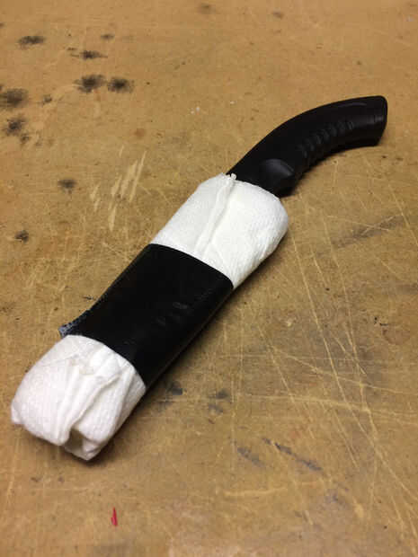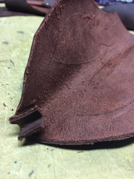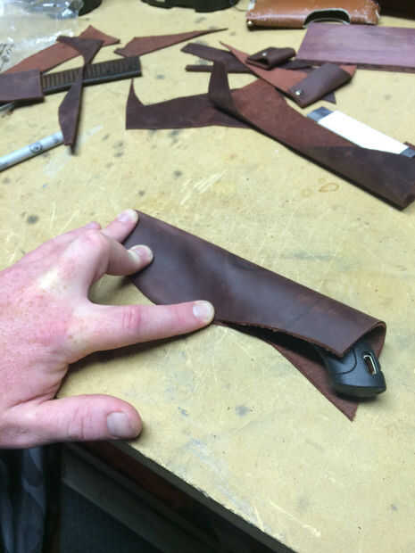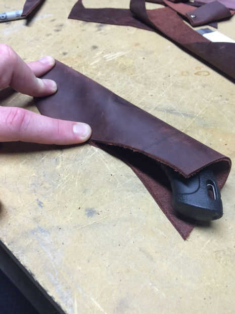 5 - doblar la pieza por la mitad sobre el cuchillo y presione firmemente hacia abajo ayudando a que el cuero se ajusta a la forma del cuchillo. No olvide de meter el extremo de la etiqueta en el interior del cuchillo ***