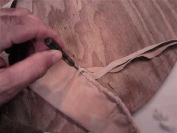 Desde la punta del cuchillo. Doble cuero y golpear ambos lados a la vez. Enrosque el cordón a través de ambos agujeros y hacer ambos extremos de la misma longitud. Otro conjunto de orificios un poco menos de un cuarto de una pulgada más arriba de la vaina del sacador. Cruzar los cordones y pase a través de los orificios de los lados opuestos. Continuar la perforación y hasta un par de pulgadas de la parte superior del cordón.