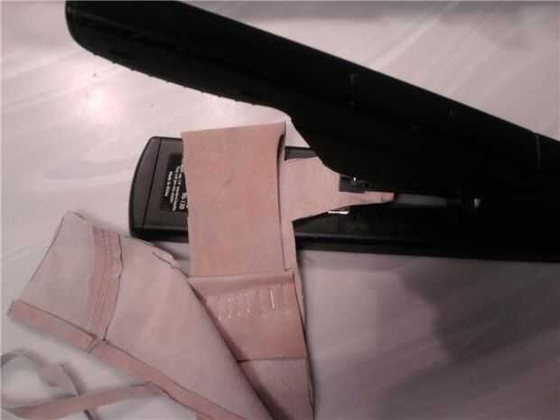 Una vez que los bordes fueron acabados, doblé la presilla más hacia el interior y, después de agregar un pedazo adicional de cuero como un parche de refuerzo, lo vertical grapas varias veces. Esto es lo que mantiene el cuchillo atado a su cinturón, así que asegúrese de que la conexión es sólida. Incluso he añadido un poco de pegamento para el seguro adicional. Doblando la lengüeta en el interior, bordes no están expuestos en la vaina terminada
