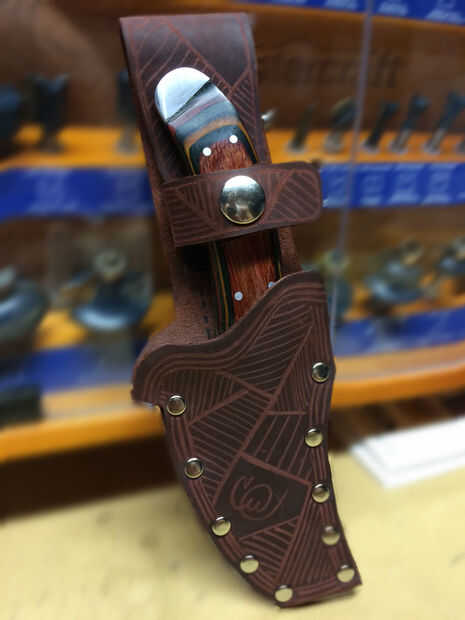 Compré un cuchillo viejo nogal americano pegatina de Ohio. Está hecho de acero de buena calidad y es menos de $15, pero necesitan un caso. Como la mayoría de los cuchillos de cocina, vino con una funda común de tarjeta. Decidí modificar que el mangui