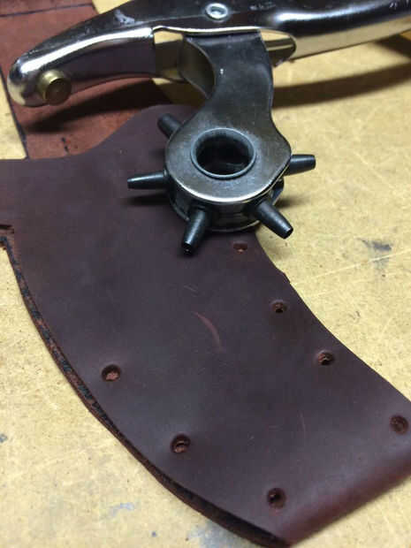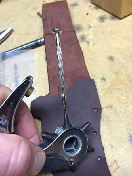 Encontrar el tamaño que se adapta a los remaches tienes y unir las dos piezas de cuero en la misma posición que en para el acabado protege y hará todos sus agujeros. Después de cada agujero, asegúrese de quitar el trozo de cuero pegado en su golpe de cuero para asegurar un agujero limpio siguiente.