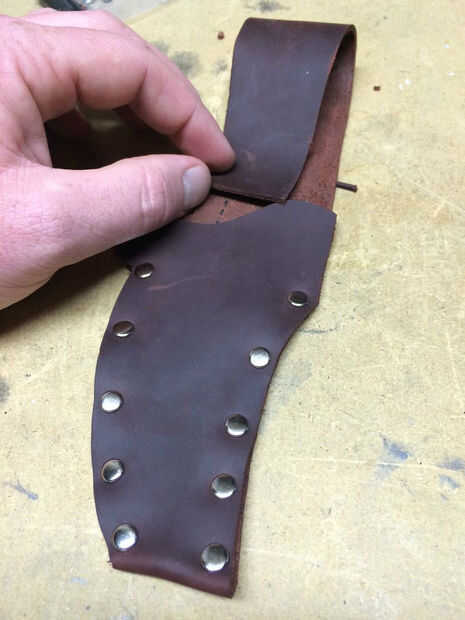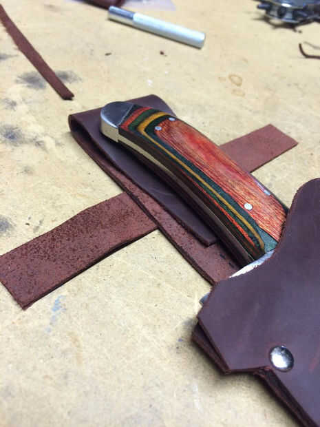 Antes de fijar la correa lazo corta una tira delgada de cuero que actuará como la pieza que sostiene la manija en su lugar mientras la lleva puesta en un cinturón.