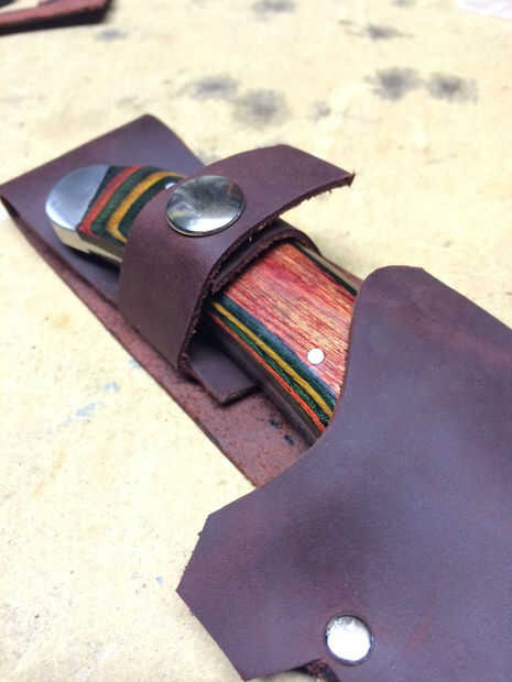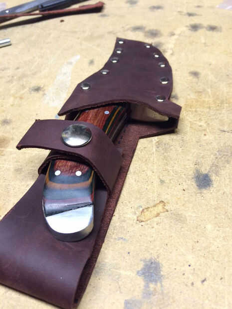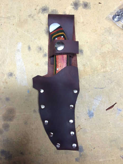 Ahora debe asegurar un botón para el pequeño pedazo delgado de piel creando una correa para fijar el cuchillo en la vaina. Esto puede hacerse con un setter de botón y de goma o martillo de madera.