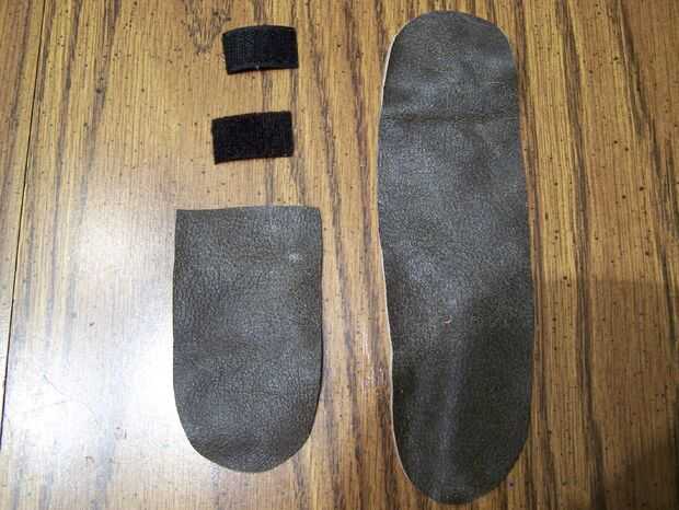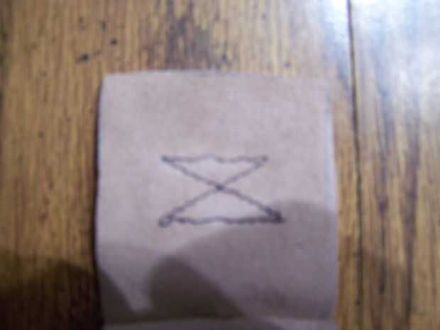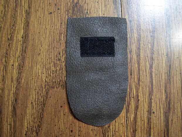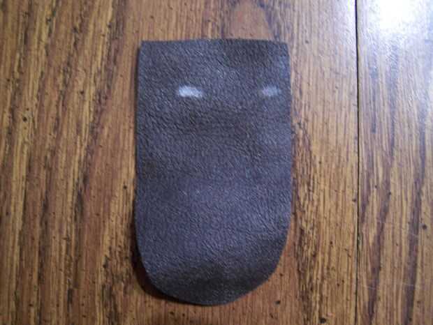 Una vez que usted haya decidido sobre la piel que vas a utilizar, seguimiento de sus patrones en el lado equivocado y recorto. Corta el velcro de 3/4" o lo que sea largo que prefiera. Toma la pieza delantera de cuero (el más corto de dos piezas), utilizar la regla y tiza para marcar 5/8 hacia abajo desde el lado plano. Luego la línea del borde superior de la parte enganchada del velcro de la marca y el pin el borde inferior. Coser a lo largo de la parte superior, quitar el pasador, coser por el medio a la otra esquina, coser la parte inferior y luego coser por el medio hacia la esquina inicial.