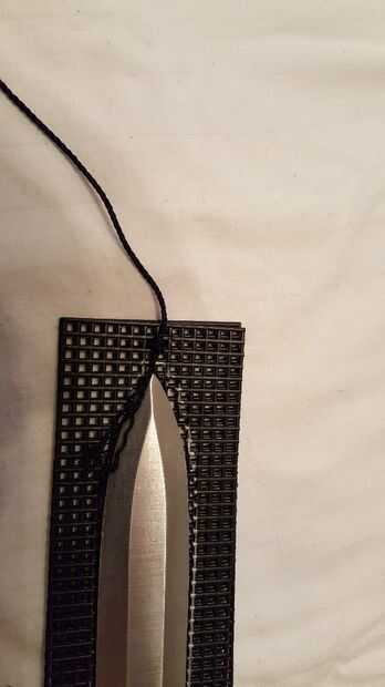 Lugar su primera puntada llevando la aguja roscada de largo fuera de sección a través de la sección interior corto que fue cortada para caber el cuchillo. Inicio en el centro de la Plaza abierto un caso del borde como se muestra en la tercera foto. Un nudo muy apretado en el interior de la caja. Esto asegurará la mitad y la espalda Junta.