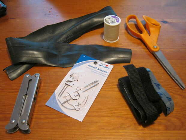 Se necesita: 1-bicicleta llanta (partido longitudinalmente) 1-carrete de hilo (yo usé hilo de lona) 1-aguja 1-cuchillo o algo por el estilo 1-lo del Adheasive Velcro 1 par de tijeras