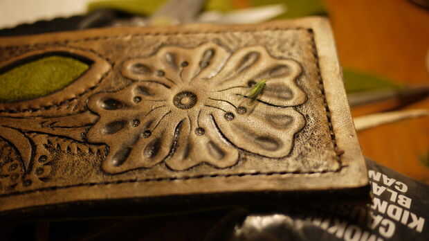 Compré un cuchillo viejo nogal americano pegatina de Ohio. Está hecho de acero de buena calidad y es menos de $15, pero necesitan un caso. Como la mayoría de los cuchillos de cocina, vino con una funda común de tarjeta. Decidí modificar que el mangui