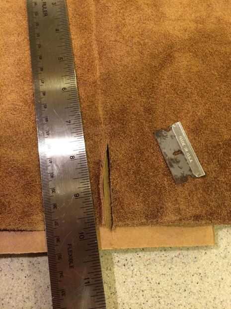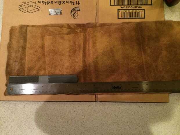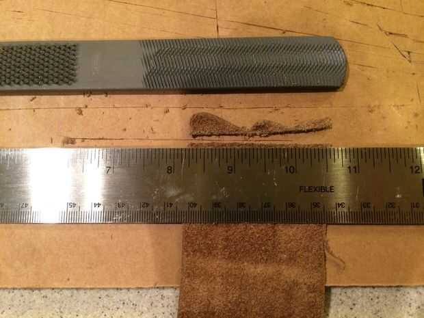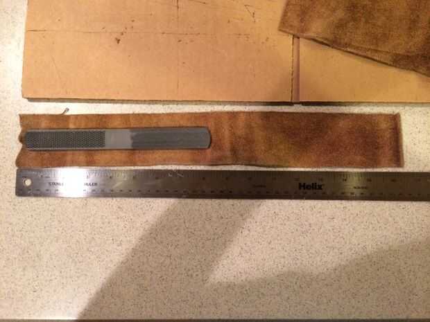 2. hacer su primer corte en el punto marcado previamente para establecer la longitud de la vaina de cuero. Sólo tomó una suposición aquí basada en la anchura de mi archivo y mi cortado a unos 2.5inches de largo. Cuando el cuero de corte es más fácil de tomar varios luz pasa vs uno muy pesado pasan.
