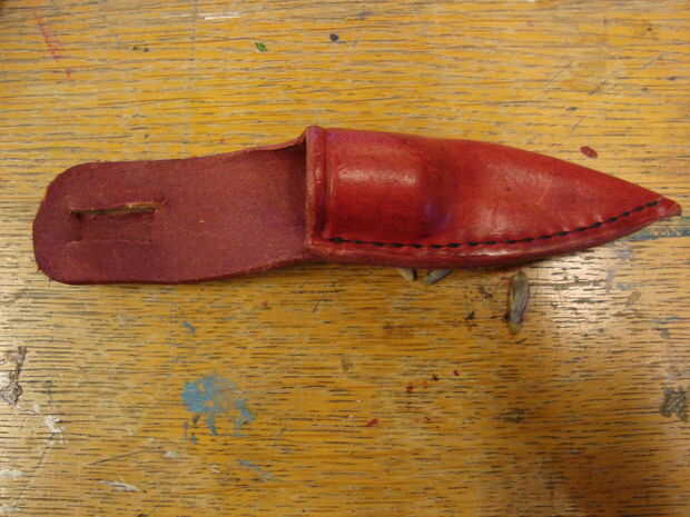 hice esta vaina con cuero de vieja botas de trabajo.Lijadora con arena el cuero a tomar de parte del color y limpia pegamento de papel.También utilicé una pieza de piel suave (nuevo) para el frente y para hacer el cordón de cuero.Ese cuchillo es tamb
