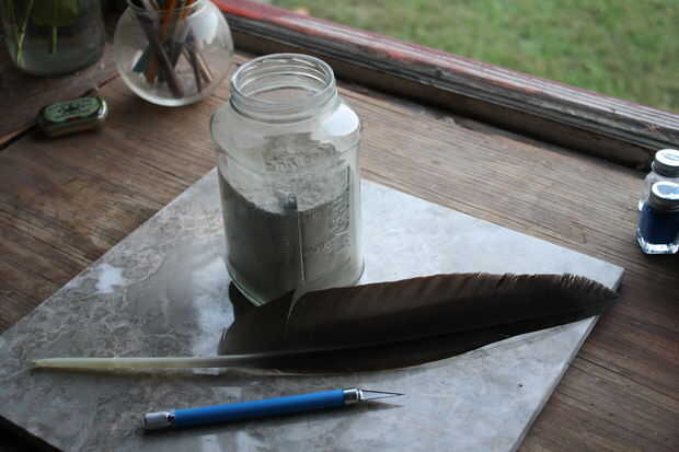 * Selección de una buena pluma es vital. El mejor tipo de pluma es 10-12" de largo, y una pluma de vuelo primaria de un ganso (estos se pueden encontrar fácilmente durante la temporada de muda en el tempranos a mediados de verano alrededor de cualquier cuerpo de agua dulce) o una pluma de cola de pavo comprado en una tienda de artesanía