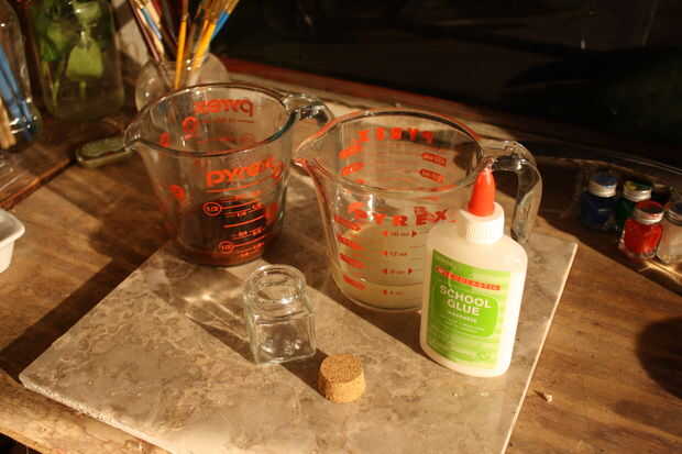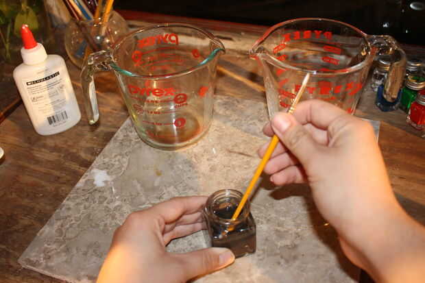 Hervir las bolsas de té negro en una taza de agua durante diez minutos. Permitir que el agua se enfríe. Mezclar a partes iguales de té y el líquido de uñas vinagre (con clavos eliminados) en el frasco. La cantidad exacta variará; Utilice bastante para llenar el tarro o frasco de 3/4 completo. Mezcla de pegamento hasta que la tinta es lo suficientemente gruesa como para escribir con.