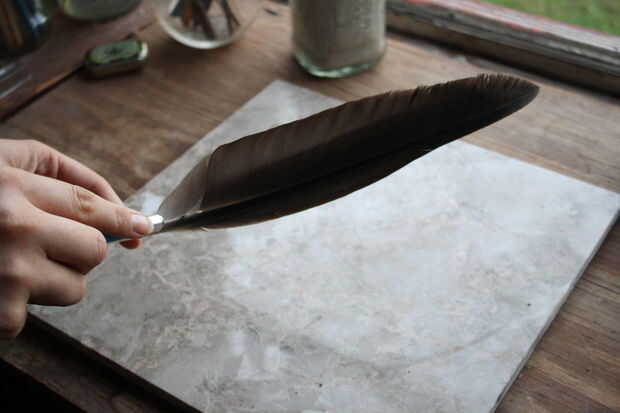 Cortar las barbas hasta que quede la cantidad deseada. Tradicionalmente, todas las barbas se cortaron y se cortó el árbol a una práctica 6-7", pero una pluma púa es más atractiva. Por lo menos cortar lo suficiente para que el lápiz se apoya cómodamente en la mano.