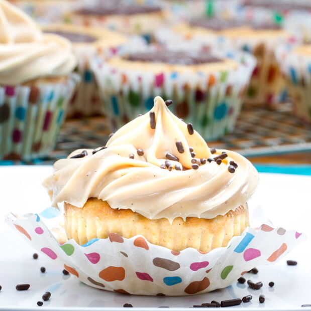 Rocíe una pequeña cantidad de mantequilla de galleta en cada cupcake y agitar ligeramente con un palillo de dientes.