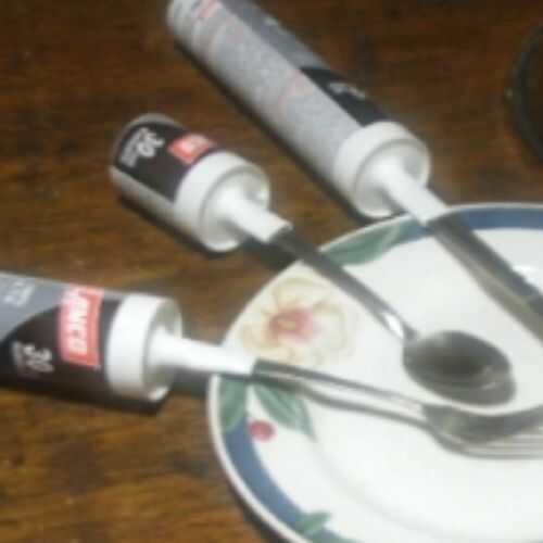 Para bloquear la boquilla cónica en los mangos de los cubiertos, corte la abertura de la punta para estar un poco en el lado demasiado apretado. Luego calentar la punta de la boquilla con un soplete de propano, u otra fuente de calor para ablandar el plástico y jam el mango cubiertos en él. La apertura se estiran y se ajustan a la forma de la manija de la vajilla. Cuando el plástico se enfría y endurece la extensión de la manija deben estar asegurado en su lugar. No hay necesidad de ningún pegamento.