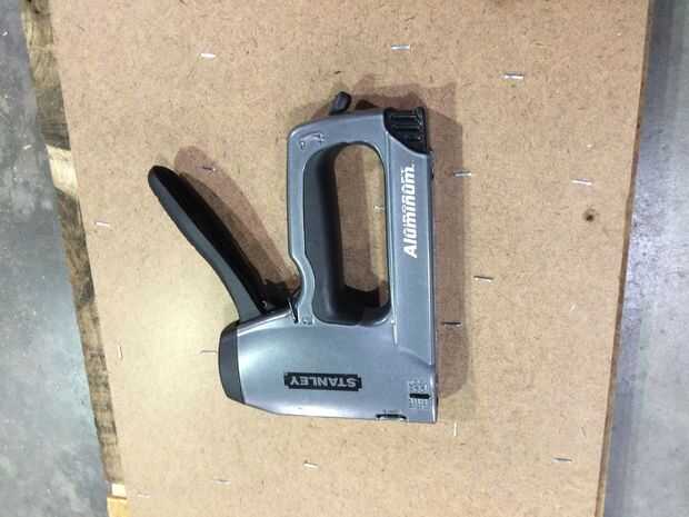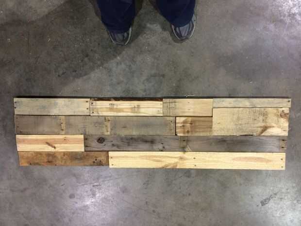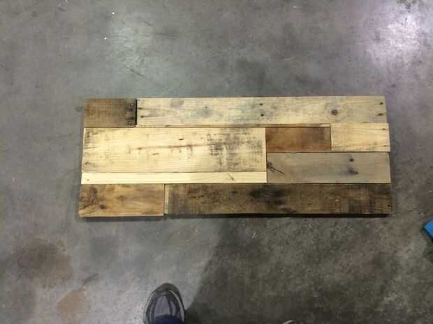Para este paso, simplemente establecer el soporte de madera prensada y arregló la madera de palet en él (asegurándose de una pulgada en la parte inferior del tablero de la proyección). Había recortado algunas piezas y creó algunas cuñas para llenar los grandes vacíos para conseguir el look que queríamos. Entonces, se trasladó la madera dispuesta de la tabla y coloca en el suelo en el mismo orden sobre el soporte de madera. Ahora utilizamos un resistente todo adhesivo de uso en la madera prensada. A continuación rápidamente puso las tablas en la madera prensada en el arreglo predeterminado y ponderado cada sección durante al menos 24 horas (que eran super lujo con campanas hervidor de agua y tanques de propano y otros dispositivos de peso oficial). Cuando el pegamento se seca, volcó todo y añade un montón de grapas. Ahora están listas montar en la pared/ventana a menos que desee hacer algunas alteraciones cosméticas las valencias.