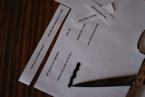 así que todo lo que necesitas es pensar algunas fortunas ingeniosos y utilizar tu ordenador para imprimirlas en una hoja de papel. luego cortar a pedazos individuales de papel que caben a la cookie. no mayor de dos pulgadas.
