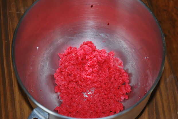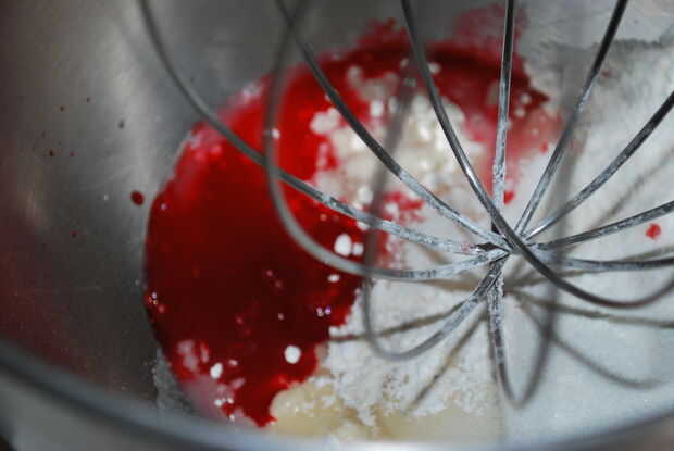 en la cocina-ayuda agregar 8 harina blanca Tbl, 1 1/2 cucharadita de maicena, 1/4 cucharadita de sal, 8Tbl azúcar, 4 cucharaditas de agua y 1/2 cucharadita colorante rojo. batir con la batidora a velocidad media hasta que haya hecho una pasta roja suave. Retire la mezcla del recipiente y reserva.