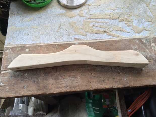 Comencé tomando el larguero de la plataforma (que es la gran cantidad de madera que las tablas en). Tener una percha normal de mi armario tengo una forma áspera y la longitud de la sección de colgantes, dibujo sobre la madera con lápiz. Corté la madera longitud sabio (necesitará otro pedacito de madera, así que guárdelo) antes de cortar a la forma correcta. Utilicé una sierra de calar para obtener la forma y donde no estaba muy contento con él lijarlo, usando a mi Bosch todo más redondo con el delta lijado pastillas (estoy seguro que podría utilizar otra o salirse con una lijadora orbital). Yo solamente lijar para la forma por lo que se utilizó papel de lija áspero, las más duras que tuve. Usted puede conseguirlo liso una vez su feliz, darle bordes redondeados.