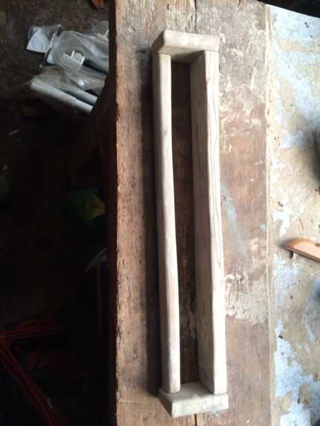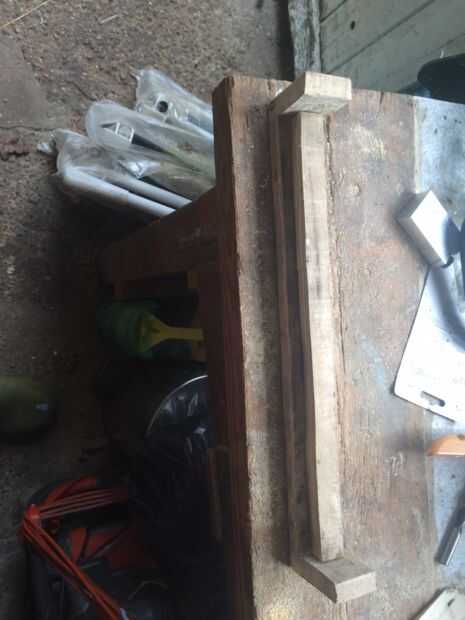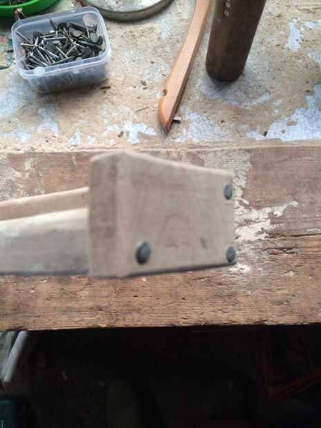 La sección pantalón se corta a la misma longitud que la suspensión de la camisa. Esto puede medirse o simplemente pone la suspensión de la camisa en una tabla y dibuje una línea donde viene hasta y cortar allí. Una vez que la longitud que se debe medir la tabla y determinar dónde cortar, necesita cortar un tercio de él apagado a lo largo del lado más largo (como se ve en la foto). Ahora usted necesita hacer dos pequeños conectores 40 mm de longitud y el mismo ancho de la mayor punta de la tabla que sólo se cortan. Antes de ir cualquier más lejos esto tiene que lijar hasta liso y redondear todos los bordes. Ahora montar como en la imagen... y hay el colgador para pantalones.