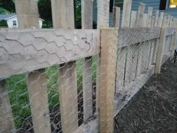 Trabajando a lo largo de la baranda superior sólo, dejar 6" de superposición en la esquina y grapa a lo largo del interior de la valla. A mantener la parte superior del alambre de pollo en el mismo (o un poco por debajo) la parte superior del travesaño superior. Grapa para los postes y rieles como vas en la parte superior. Después de que has conseguido en la parte superior, tire hacia abajo para poner cierta tensión leve en el alambre de pollo y empezar a grapar al riel inferior. Empuje el resto del alambre de pollo hacia abajo en la fosa para asegurarse que sea hasta el fondo. Se puede doblar el alambre de pollo de sobra bastante fácilmente en la parte inferior de la zanja. Hacerlo en los 4 lados y asegúrese de que la vuelta es adecuada prevenir las separaciones.